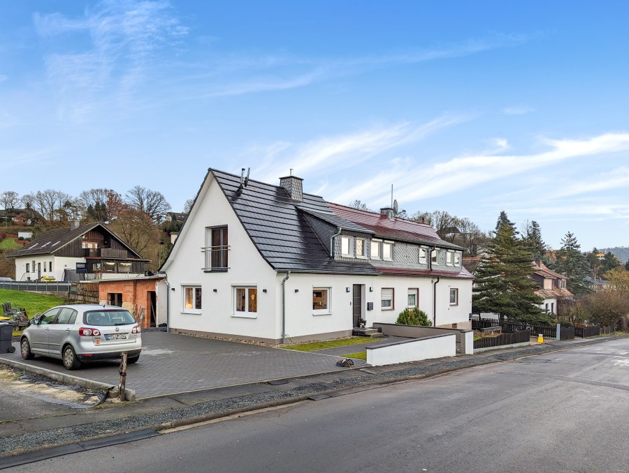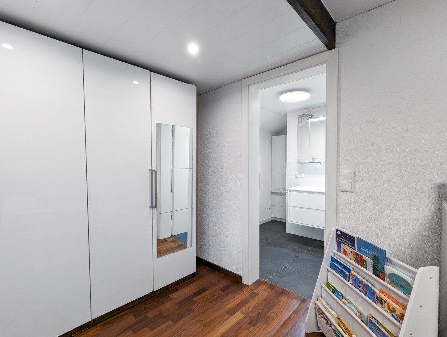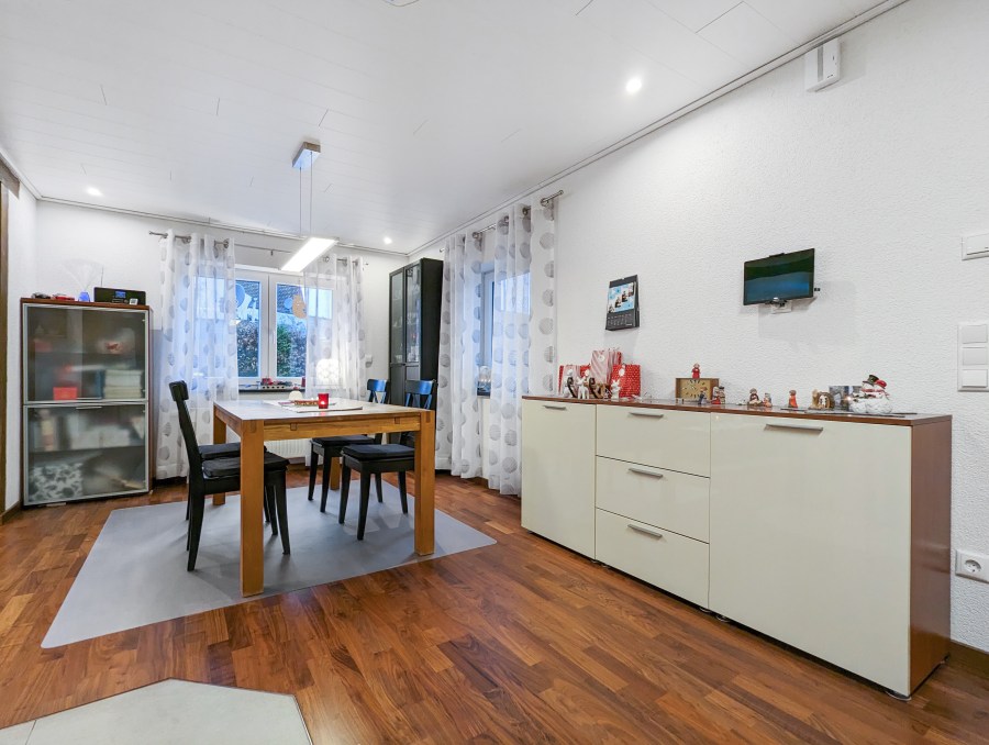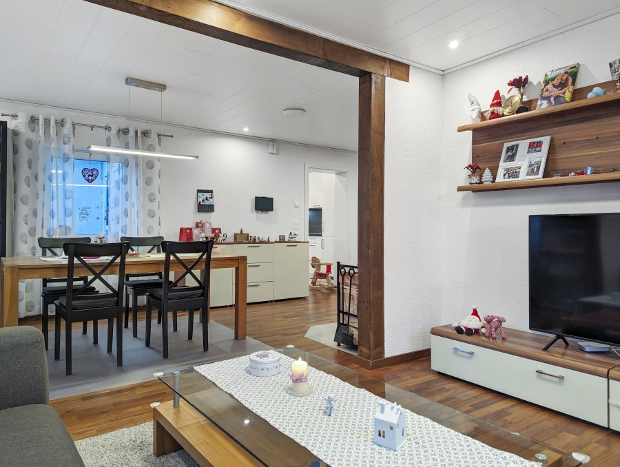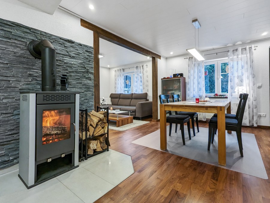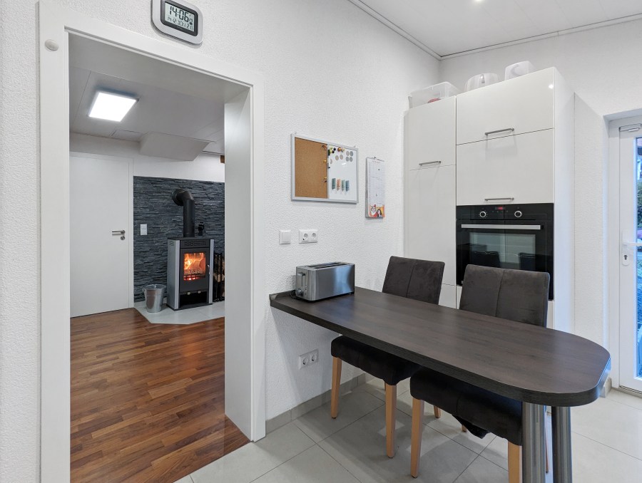 Lassen Sie sich von diesem wunderschönen, frisch sanierten Einfamilienhaus begeistern! Das Haus besticht durch eine ausgezeichnete Raumaufteilung, seine moderne, neuwertige Ausstattung und eine sehr gute Energiebilanz. Der Anbau bietet Ihnen zudem die Möglichkeit Ihre eigenen Ideen zu verwirklichen. Im Erdgeschoss bildet der großzügige lichtdurchflutete Wohn- und Essbereich den einladenden Mittelpunkt des Hauses und lässt sofort eine Wohlfühlatmosphäre aufkommen. Der Kamin sorgt zusätzlich für ein wohliges Ambiente in der kalten Jahreszeit. Eine helle, moderne Küche und ein Gäste-WC runden das Raumangebot im Erdgeschoss ab. Über eine massive Holztreppe gelangen Sie in das helle Obergeschoss. Hier erwarten Sie ein offener Vorraum, den Sie z.B. als Büro nutzen können und ein geräumiges Schlafzimmer.