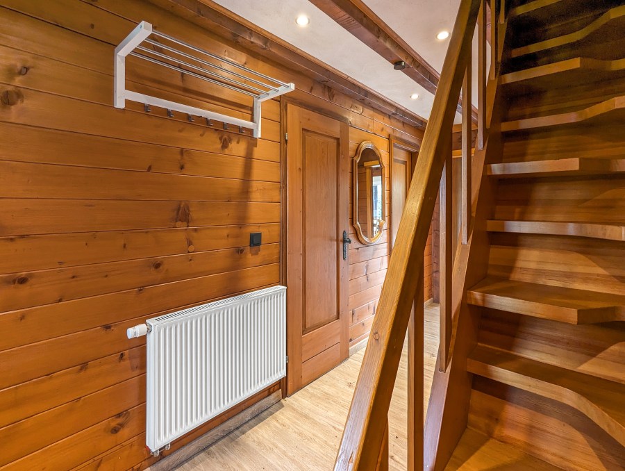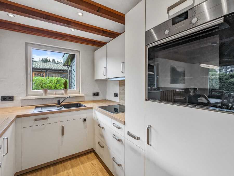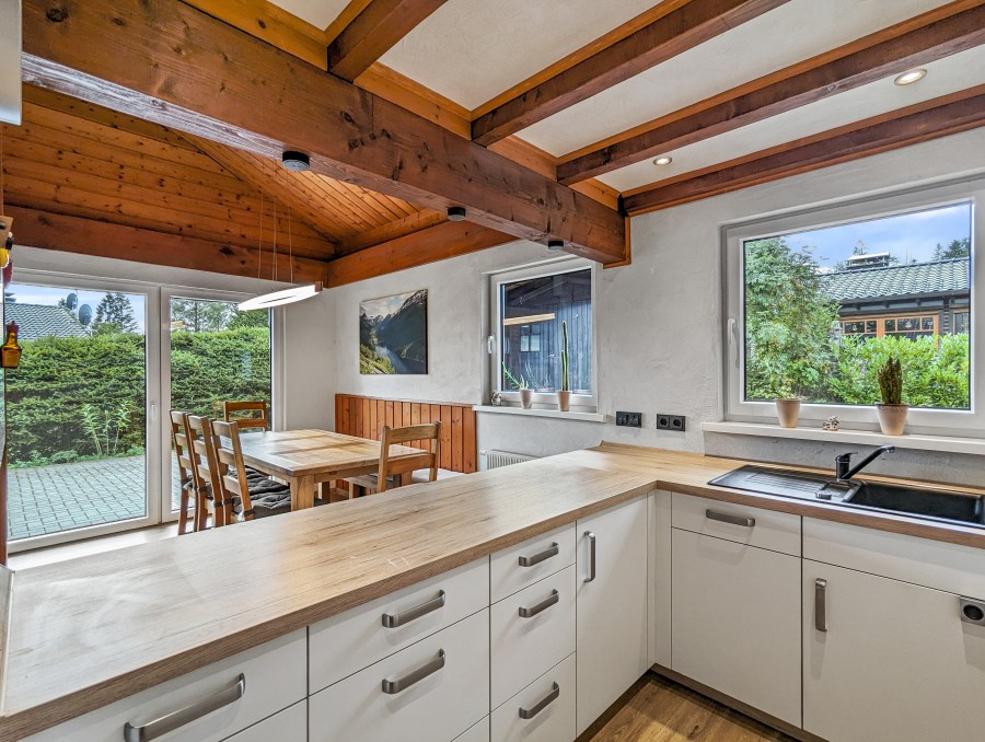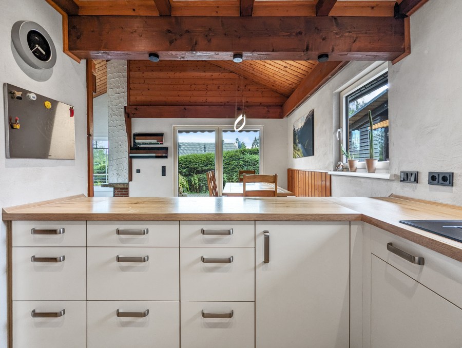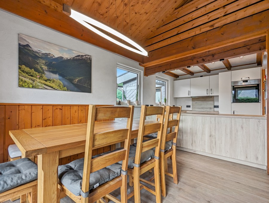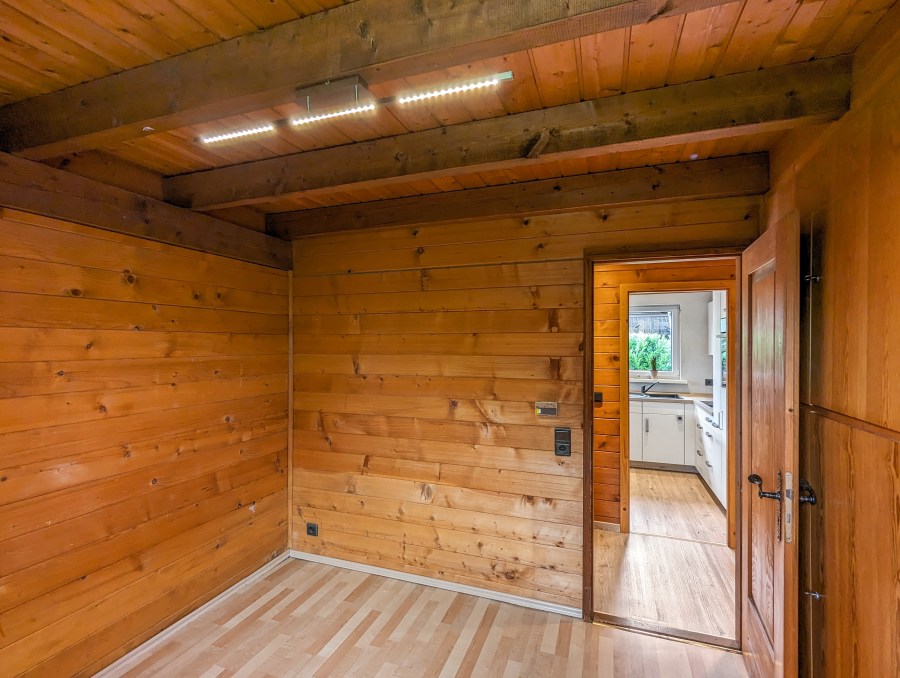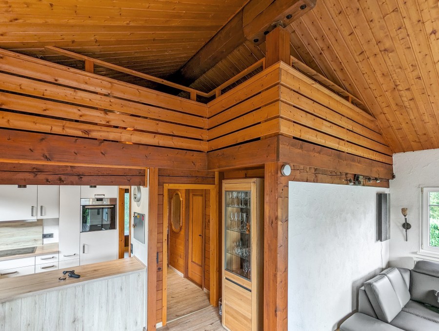 Die hochwertige Holzvertäfelung verleiht den Räumen einen natürlichen und einladenden Charakter. Der großzügige Wohn- und Essbereich ist das Herzstück des Hauses, der viel Raum für geselliges Beisammensein bietet und sofort eine Wohlfühlatmosphäre aufkommen lässt. Große Fensterflächen durchfluten den Innenraum mit Tageslicht. Der Kamin sorgt zusätzlich für ein wohliges Ambiente in der kalten Jahreszeit.
