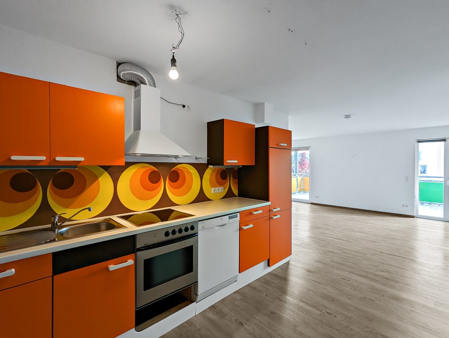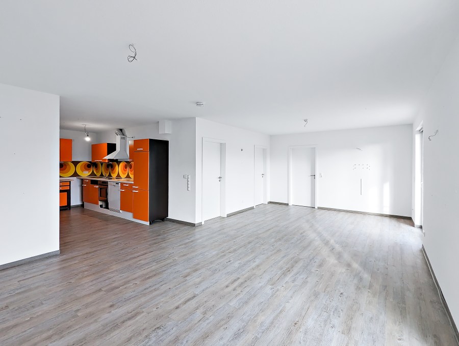Über den offen gestalteten Flur gelangen Sie in das Herzstück der Wohnung- das 31 m² große lichtdurchflutete Wohnzimmer mit offener Wohnküche. Durch die Größe und den modernen Schnitt entsteht ein ansprechender Loft-Charakter. Die bodentiefen, 3-fach verglasten Fenster und zwei Balkone schaffen eine angenehme, helle Wohnatmosphäre und bieten einen schönen Ausblick ins Grüne und die ruhige Umgebung.