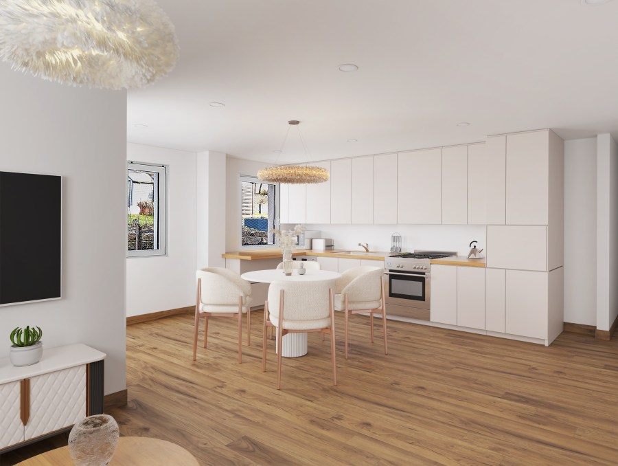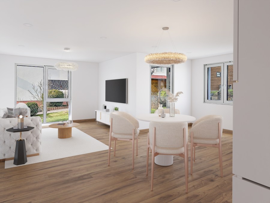 Die lichtdurchflutete Eigentumswohnung Nr. 2 mit einer Wohnfläche von 92,26 m² umfasst einen großzügigen Wohn-Essbereich mit offener Küche, zwei gemütliche Schlafzimmer, einen praktischen Abstellraum und ein Tageslichtbadezimmer mit bodengleicher Dusche. Es besteht zudem die Möglichkeit, gegen Aufpreis eine Badewanne zu installieren. Derzeit sind vom Bauträger moderne Fliesen in Betonoptik und/oder hochwertige Linoleumböden in Holzoptik geplant und im Preis enthalten. Die Bodenbeläge und Ausstattung können nach Absprache und ggf. Aufpreis individuell nach Ihrem Wunsch angepasst werden. Die ansprechende Terrasse, die ebenfalls hochwertig gestaltet und mit Außenbeleuchtung und einer Außensteckdose ausgestattet ist, lädt zu gemütlichen Sommerabenden ein.