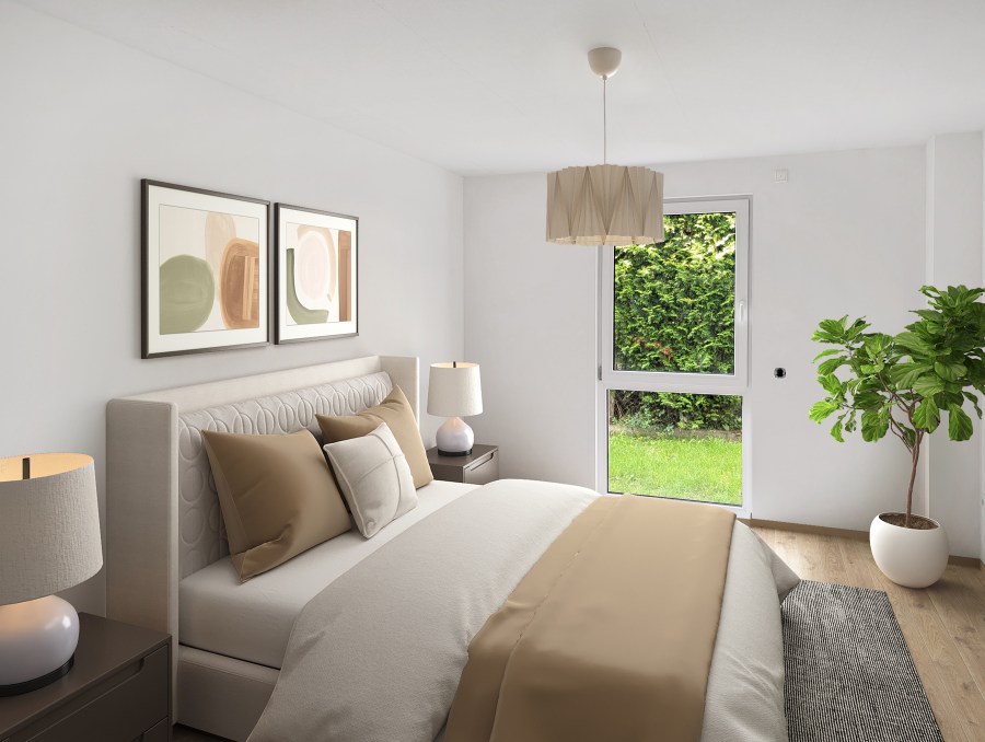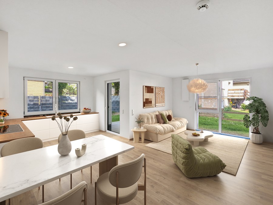 Die lichtdurchflutete 2 - Zimmer - Wohnung mit einer Wohnfläche von 68,91 m² befindet sich im Erdgeschoss der Immobilie und umfasst einen großzügigen Wohn- und Essbereich mit offener Küche, ein gemütliches Schlafzimmer, einen praktischen Abstellraum sowie ein Tageslichtbadezimmer mit bodengleicher Dusche. Die ansprechende Terrasse, die ebenfalls hochwertig gestaltet und mit Außenbeleuchtung und einer Außensteckdose ausgestattet ist, lädt zu gemütlichen Abenden im Freien ein.